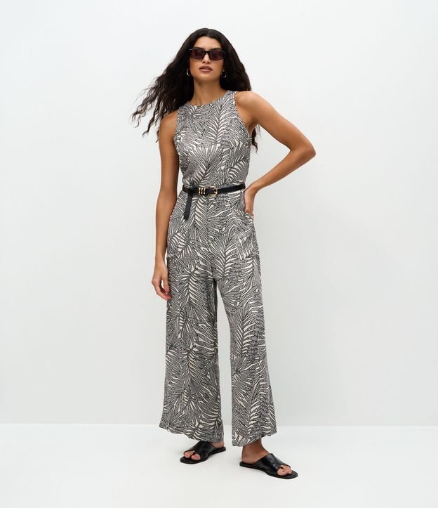 Macacão feminino confeccionado em viscose twill, de modelo longo, com gola redonda e alças largas. Possui estampa monocromática de folhagens e abertura em gota nas costas.