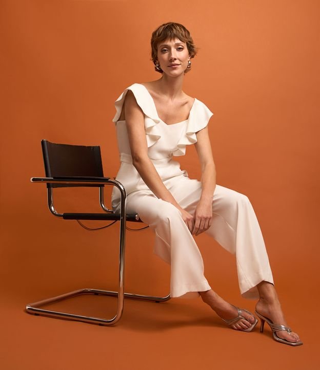Macacão Sem Manga em Crepe com Babados e Lastex Branco Neve