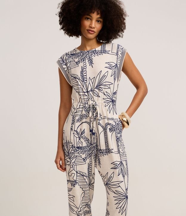 Macacão texturizado e sem mangas, confeccionado em viscose, com gola redonda, cavas listradas de tricô, amarração na cintura e bordados de folhagens com paisagem arquitetônica. Este produto possui viscose certificada em sua composição, sendo ambientalmente mais responsável.