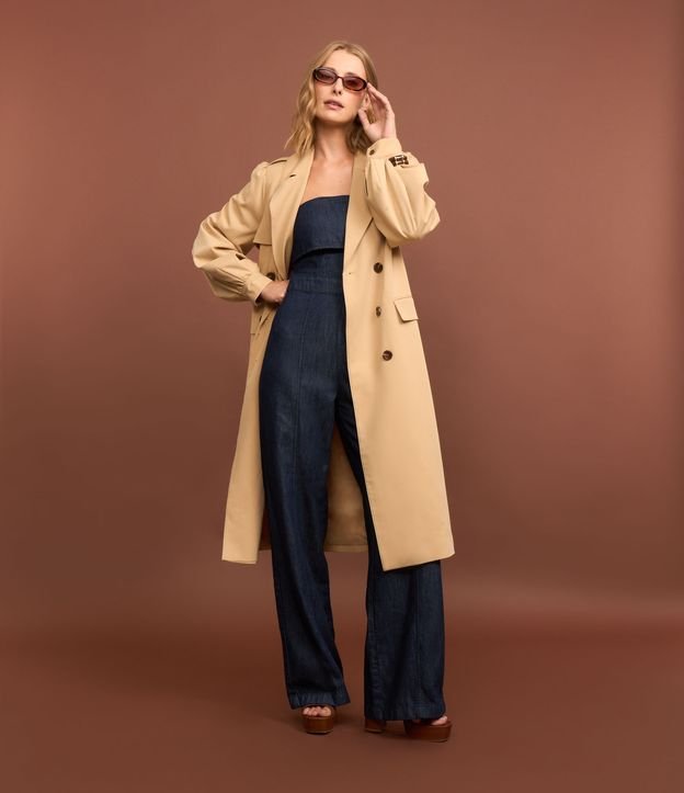 Macacão feminino em jeans mais sustentável, tomara que caia com sobreposição no busto.