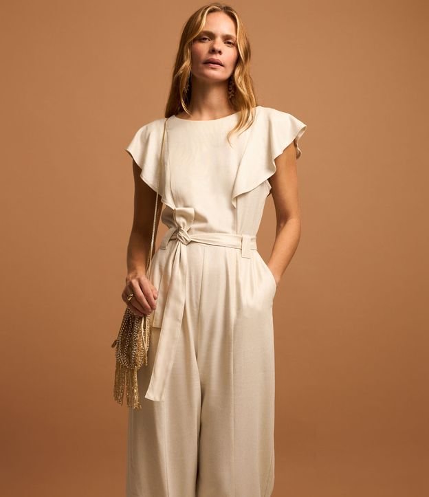 Macacão Wide Leg em Viscolinho com Babado e Cinto Faixa