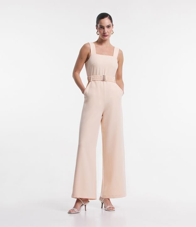 Macacão Wide Leg Sem Manga em Crepe com Cinto de Elástico Afivelado
