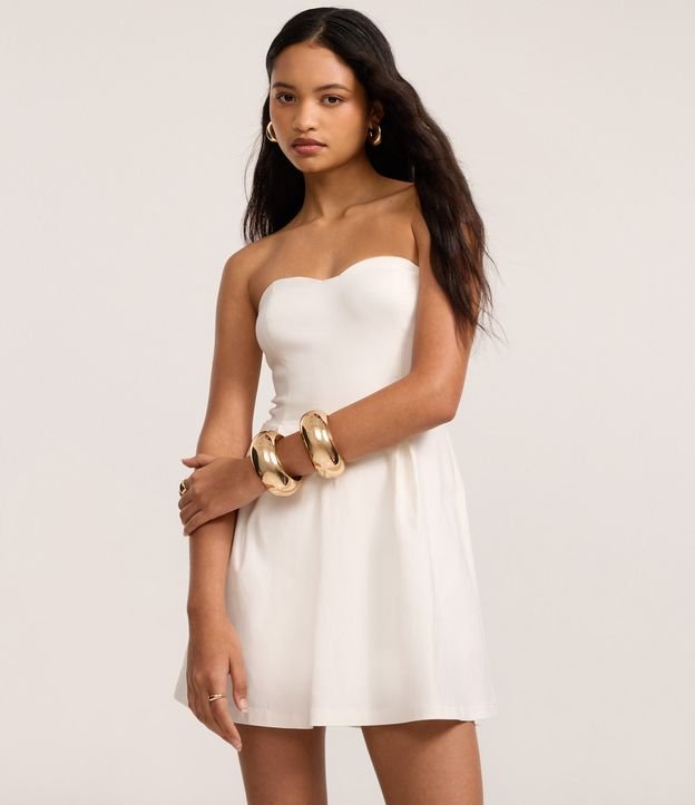 Macaquinho feminino confeccionado em bengaline de material mais sustentável. Possui decote em formato coração, sem alças, com saia e preguinhas frontais.