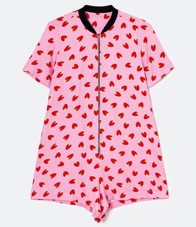 Macaquinho em Viscose com Zíper na Frente Estampa Morangos