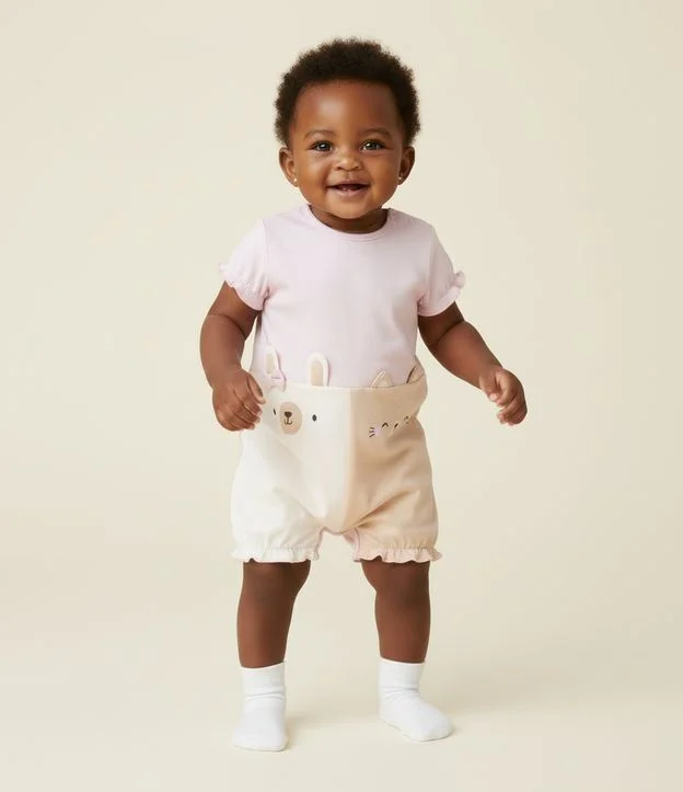 Macaquinho para bebês confeccionado em algodão mais sustentável através de boas práticas ambientais, no modelo curto. Possui gola redonda, com fechamento traseiro de gota, manga curta, fechamento no entrepernas, estampa interativa de coelhinho e gatinho e frufrus.