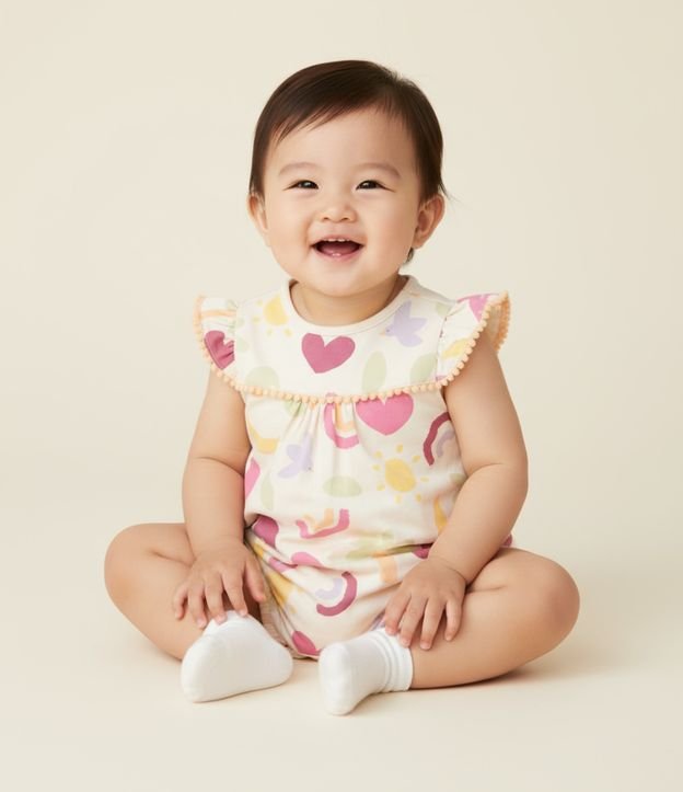 Macaquinho Infantil com Estampa Praia e Babadinhos - Tam RN a 18 meses Bege