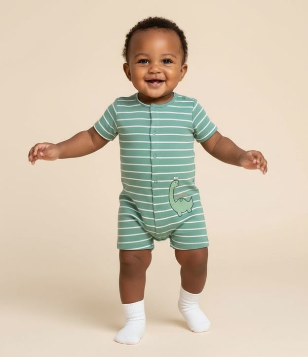 Macacão infantil confeccionado em suedine mais sustentável, no modelo curto. Possui gola redonda, manga curta, abotoamento, fechamento no entrepernas, listrado e com bordado de dinossauro.