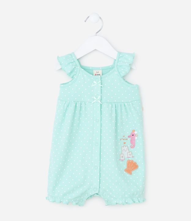 Macaquinho Infantil Suedine Poa com Babado e Bordado – Tam RN a 18 Meses Verde Água