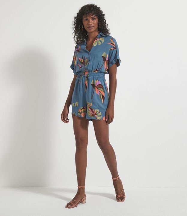 Macaquinho Manga Curta em Viscose com Estampa de Folhagem