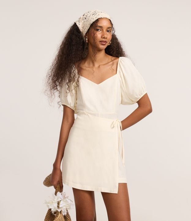 Macaquinho Short Saia em Viscolinho Transpassado e com Amarração Off White