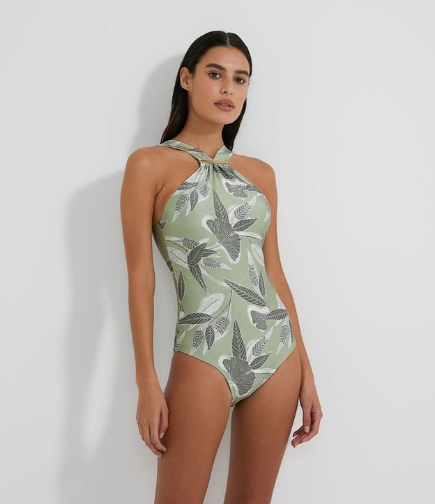 Maiô em Poliamida com Estampa de Folhagem e Placa no Decote