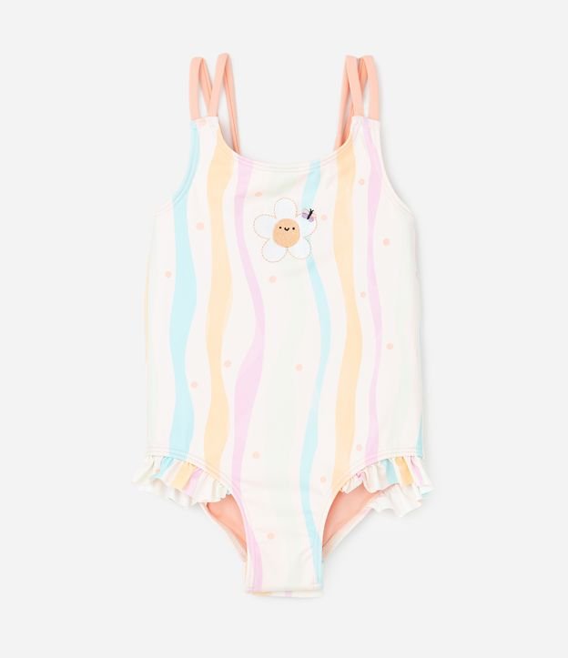 Maiô infantil confeccionado em microfibra de poliamida com elastano, oferecendo leveza, secagem rápida e caimento confortável. O modelo possui alças finas duplas, decote arredondado e estampa multicolorida com flor bordada. Detalhe de babadinhos na cava das pernas complementa o visual delicado e lúdico.
