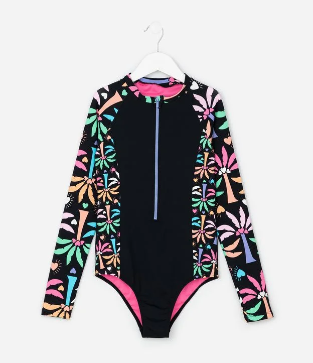 Maiô Infantil com Manga Longa e Estampa Floral – Tam 5 a 14 Anos Preto