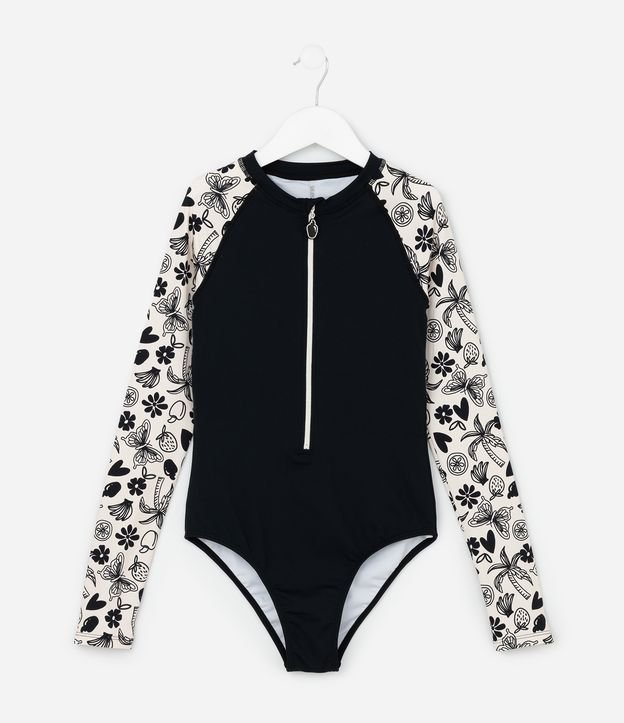 Maiô Infantil com Proteção UV e Mangas Estampadas - Tam 5 a 14 Anos Preto