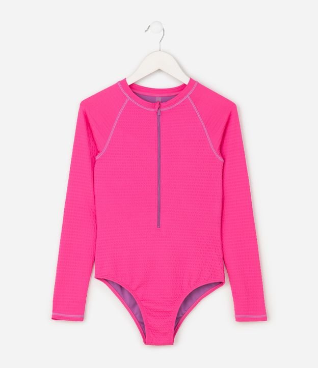 Maiô infantil texturizado, com gola redonda, mangas longas e fechamento por zíper contrastante. Possui textura e proteção UV.