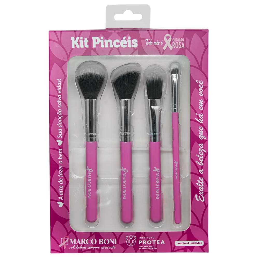 O Kit De Pincéis Faciais Para Maquiagem Outubro Rosa da Marco Boni conta com quatro pincéis: