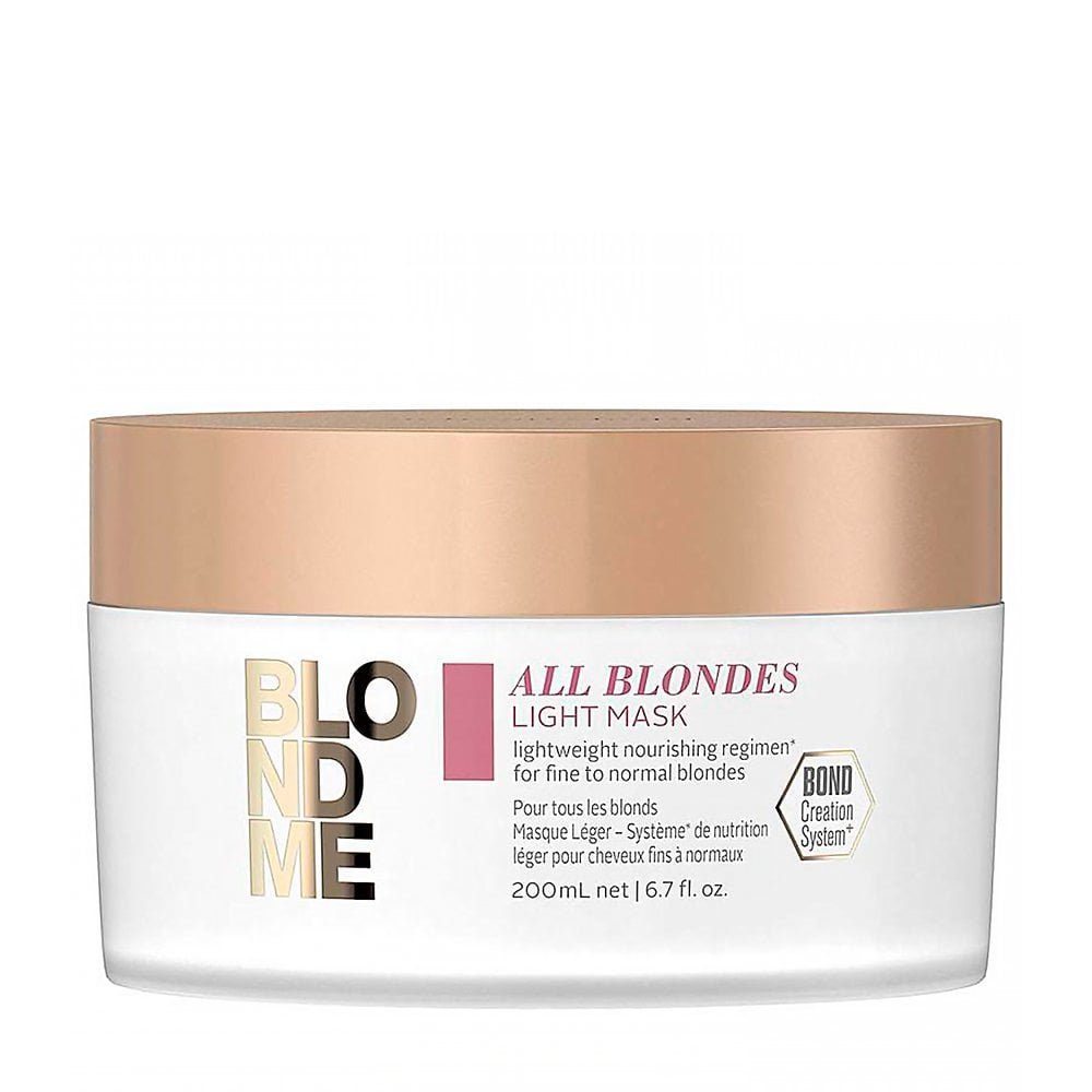 Máscara Schwarzkopf Blond Me Light 200ml A Máscara BlondMe All Blondes Light, com tecnologia de criação de vínculo 3D e complexo de proteína da seda, ajuda a construir novos vínculos, enquanto deixa cabelos loiros finos a normais com uma sensação forte e flexível com brilho de aparência saudável. Indicação: Cabelos loiros finos a médios. Sua fórmula conta com Tecnologia Bond Creation 3D, Pantenol e Complexo de Proteína de Seda – ajuda a criar pontes, enquanto fortalece cabelos, e nutre intensivamente as madeixas sem sobrecarregar. Seus cabelos loiros mais volumosos e com brilho, sem sobrecarregar. Fórmula sem silicone. Existem inúmeros tons de loiro. O loiro pode ser desde nuances subtis banhadas por raios de sol ao claro e poderoso platinado. Pode ser tão quente como um caramelo ou tão frio como o gelo. O loiro transmite um sentimento de confiança, empoderamento. O loiro é uma das colorações mais desafiantes, mas inspiradores - ainda tido como inalcançável para a maioria.