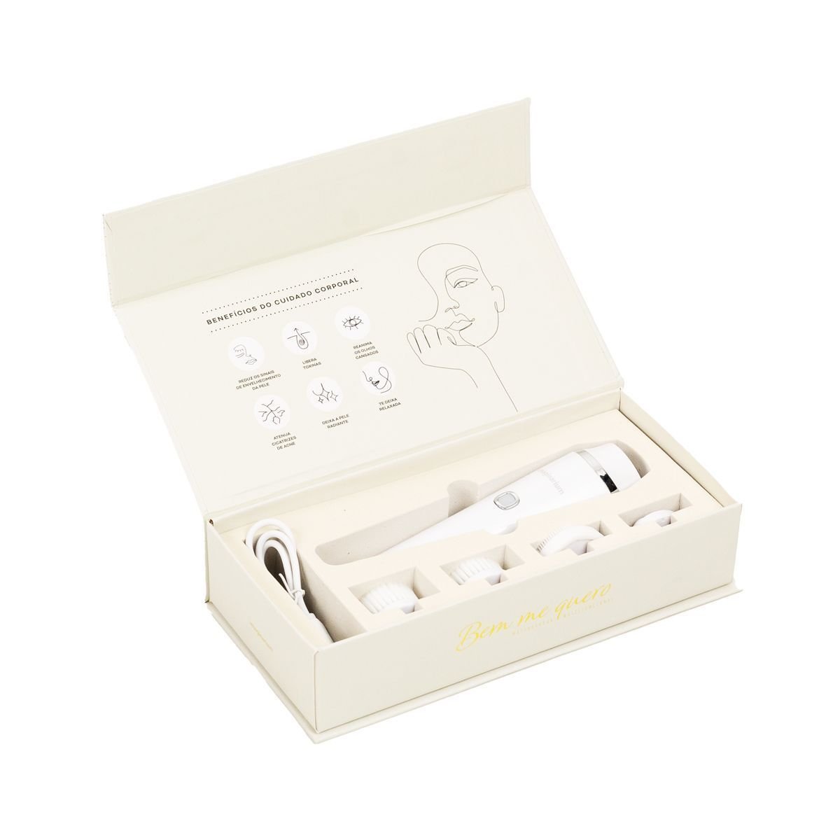 Contando com uma embalagem super charmosa, essa lindeza traz 1 aparelho massageador, 4 acessórios massageadores (cada um com uma função específica) e 1 cabo USB P4.