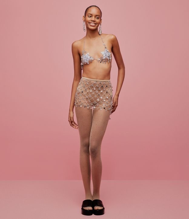 Meia calça, modelo arrastão, confeccionada em poliamida, com pedrarias de strass coloridos aplicadas.