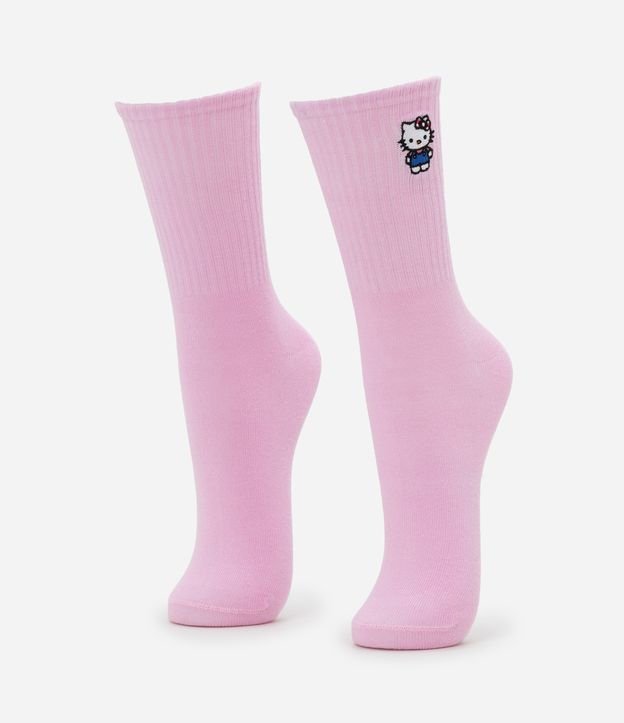 Meia Cano Alto em Algodão Bordado Hello Kitty Rosa