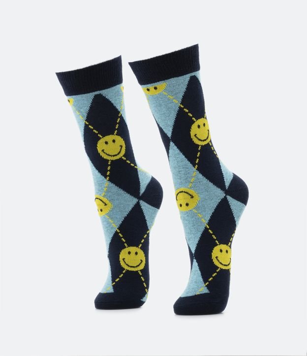 Meia Cano Alto em Algodão com Estampa Xadrez e Smiley