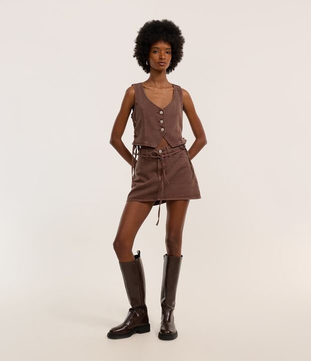 Mini Saia em Jeans com Tingimento Cationizado e Amarração no Cós Marrom