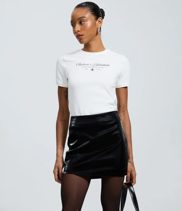 Minissaia em PU com modelagem reta e visual moderno. Possui cós estruturado e fechamento por zíper lateral, garantindo ajuste confortável. Ideal para compor looks noturnos com blusas, camisas ou tricô para diferentes ocasiões do dia e da noite fashion.