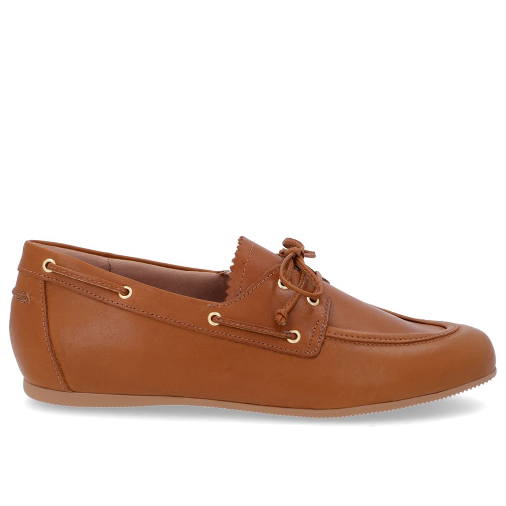 Mocassim cabedal em couro napa escovado na cor tan. O modelo possui tecnologia Amortecedor, com uma gota de borracha em sua palmilha para amortecer o impacto da pisada.
