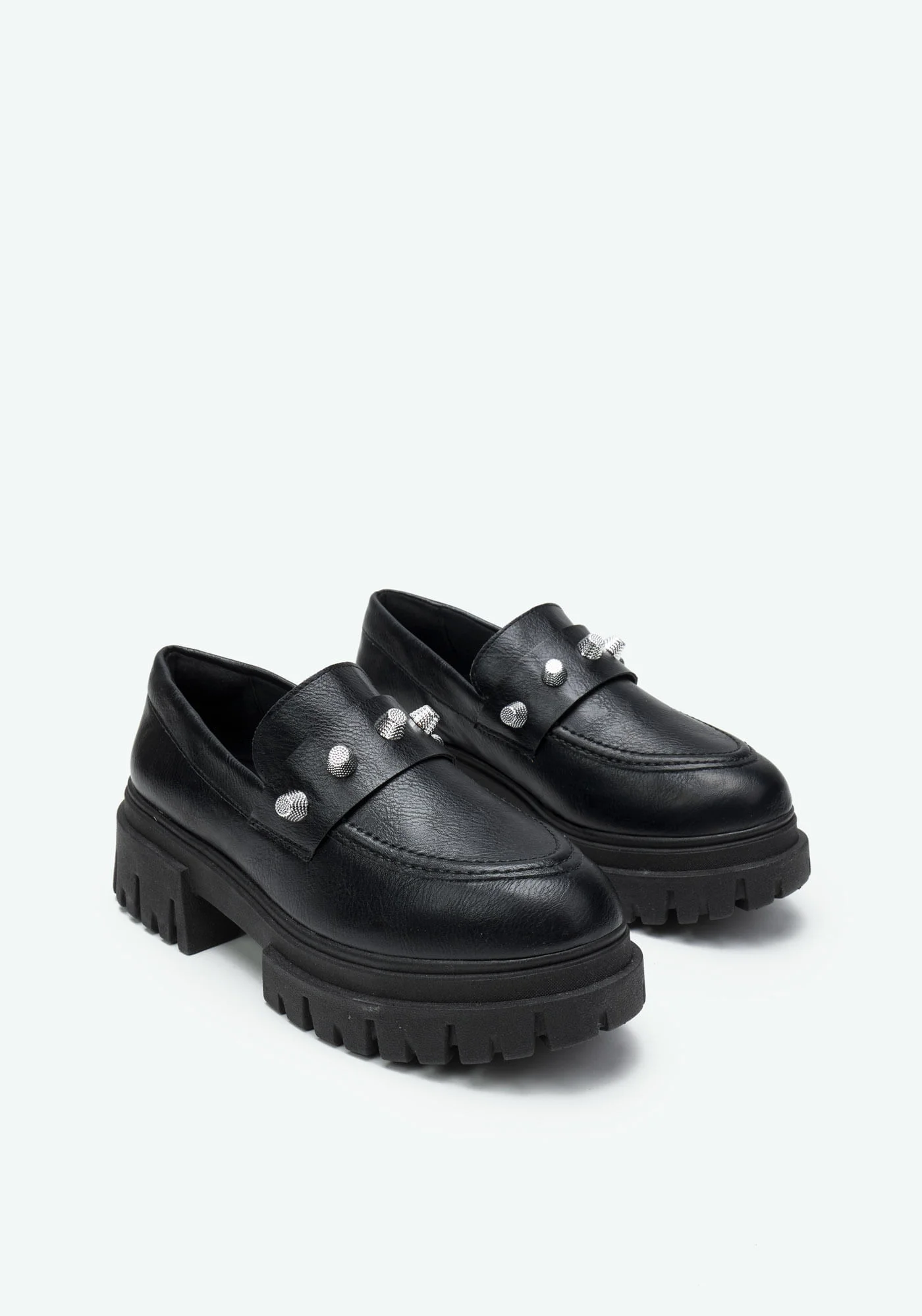 O mocassim com solado tratorado é super trendy e versátil. Os detalhes de rebites e pespontos adicionam modernidade e estilo ao visual. Aposte nesse modelo para criar looks descolados e confortáveis.