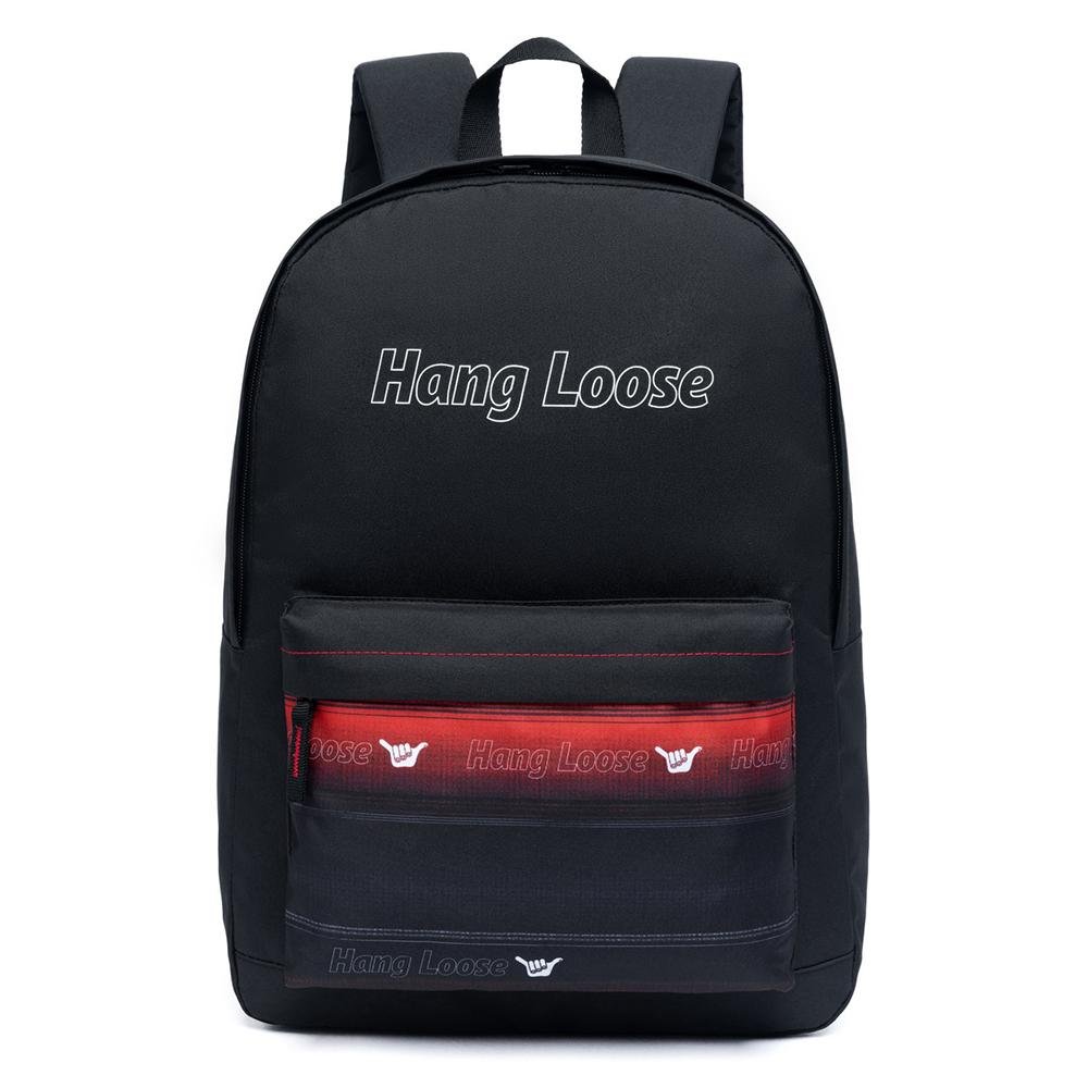 Mochila Hang Loose com compartimento principal, compartimento frontal, estampa frontal e etiquetas personalizadas.