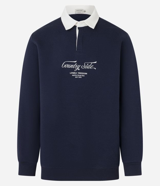 Moletom em Algodão com Gola Polo e Lettering Bordado Azul escuro