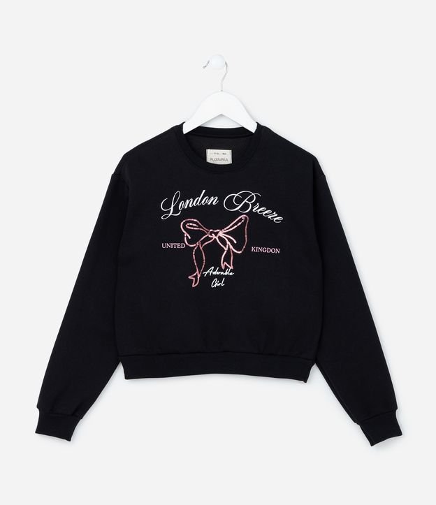 Moletom Infantil Quentinho com Laço de Paetê e Lettering - Tam 5 a 14 anos Preto