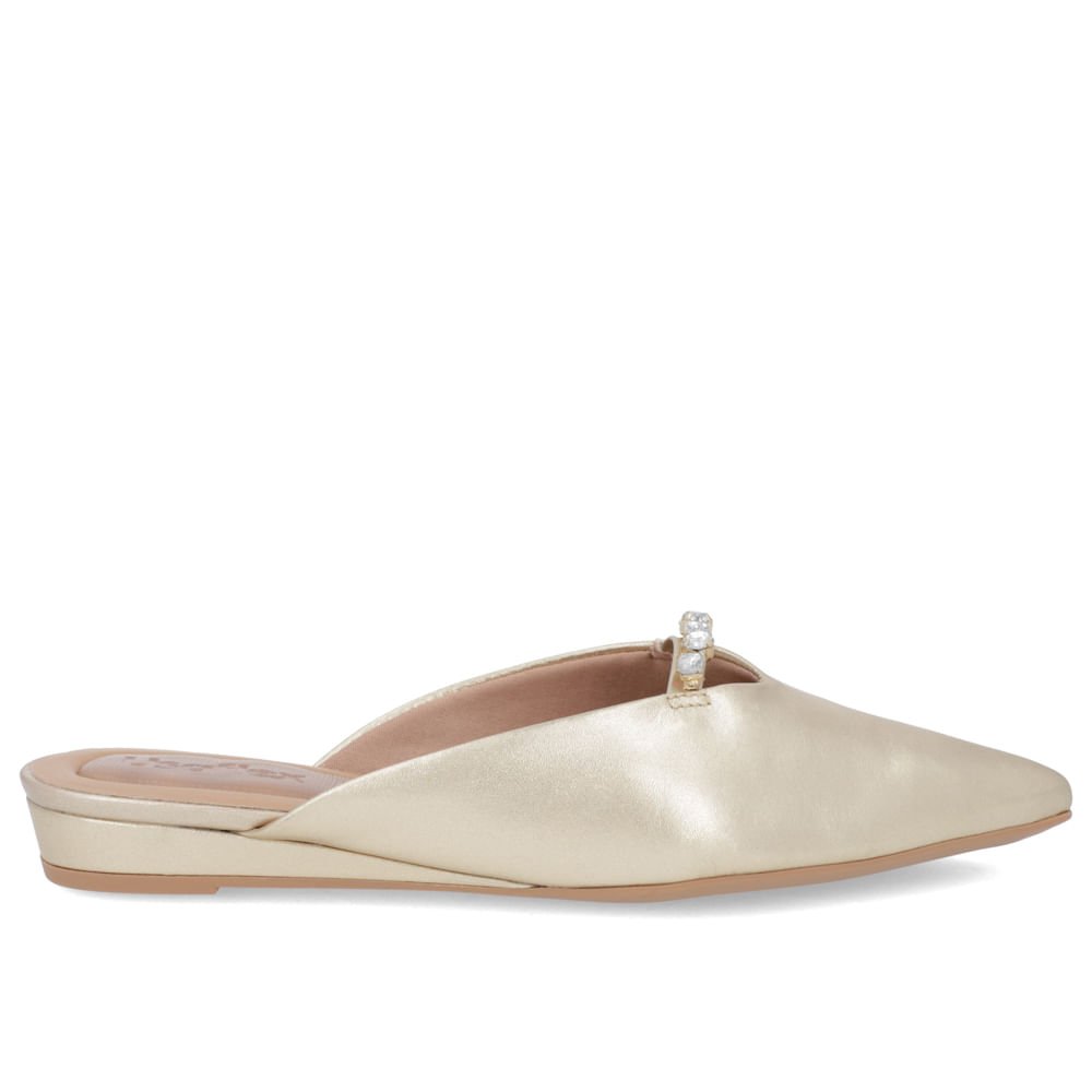 Mule Dourada Bico Fino Couro Salto Anabela