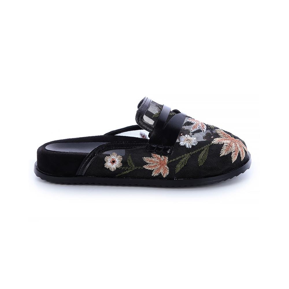 Mule Melanie Bordado Floral Tela Preto