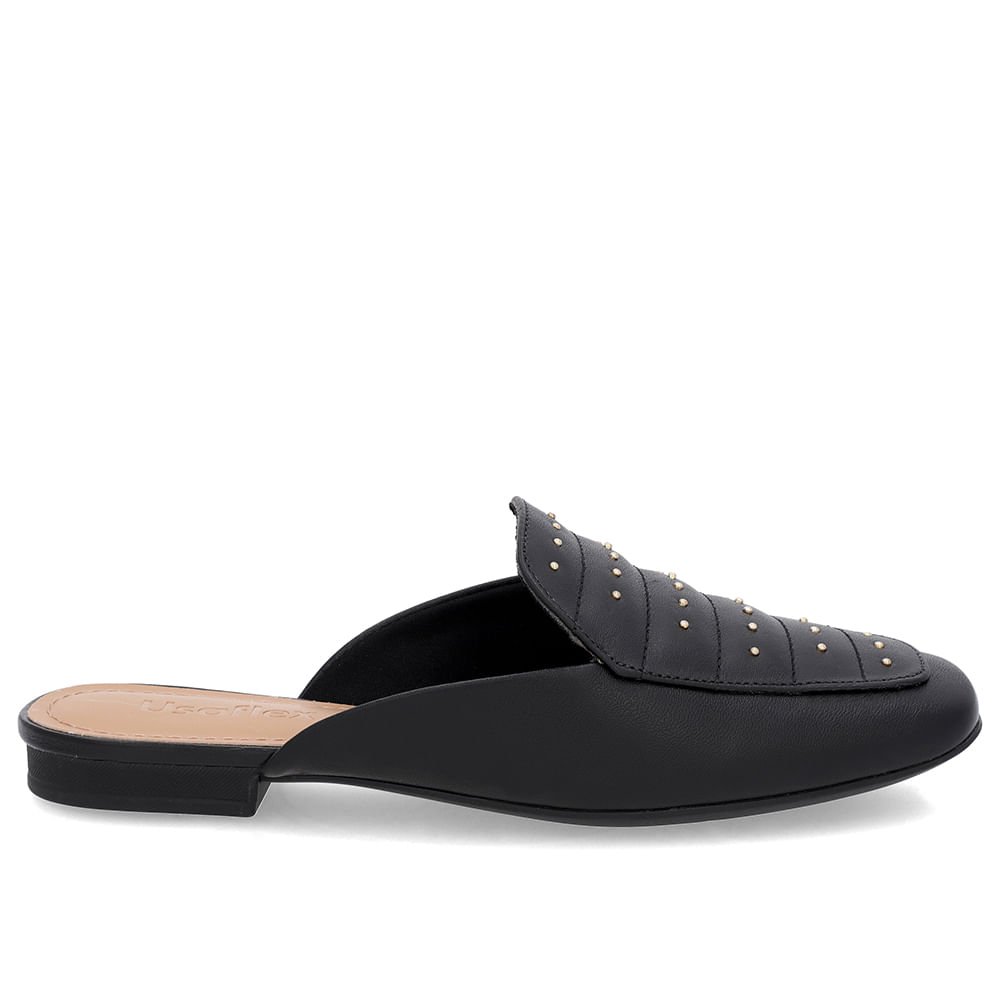 Mule Preto Couro Salto Baixo Costura Enfeite