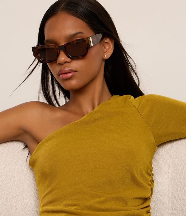Óculos de sol gateado quadrado com detalhe de metal na haste larga, estampa tartaruga e lentes marrom total. Produto com proteção UVA/UVB.