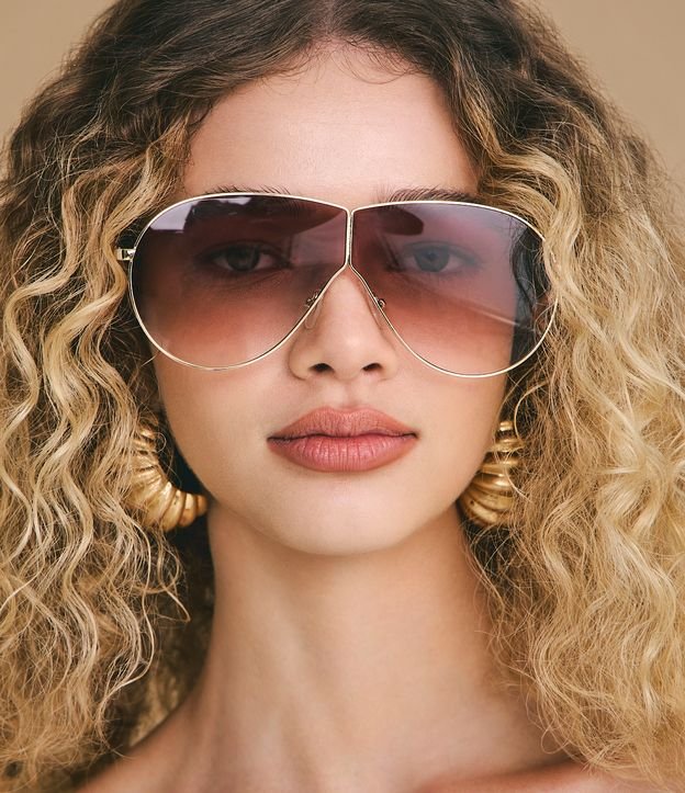 Óculos de Sol Máscara com Detalhe na Ponte e Lente Degradê Dourado