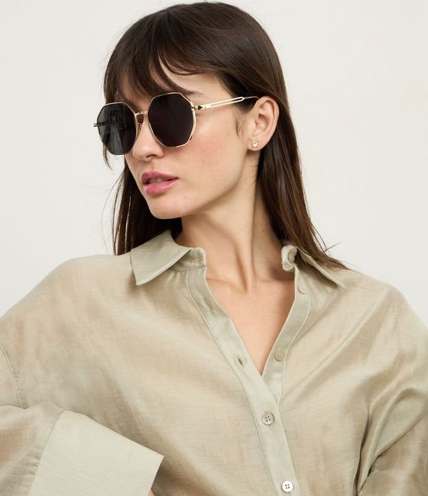 Óculos de Sol Quadrado Geométrico Grande em Metal com Lente Fume Dourado