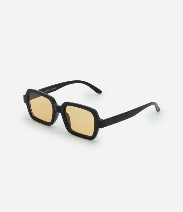 Óculos de sol no formato quadrado. Possui bordas suavizadas, acabamento fosco, lentes amareladas, hastes largas na junção com a frente e afinadas em direção às orelhas, além de dobradiças metálicas embutidas.