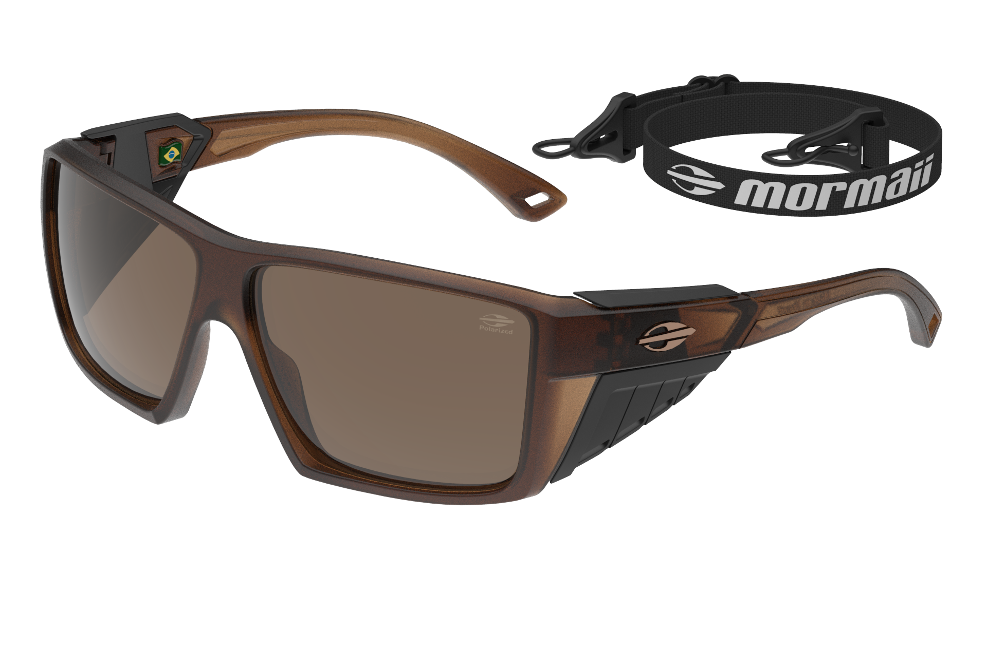 O oculos e fabricado em Grilamid na cor Marrom Fosco com hastes na cor Marrom conta com lentes em Policarbonato com 100% de protecao UVA e UVB na cor Marrom Polarizada.