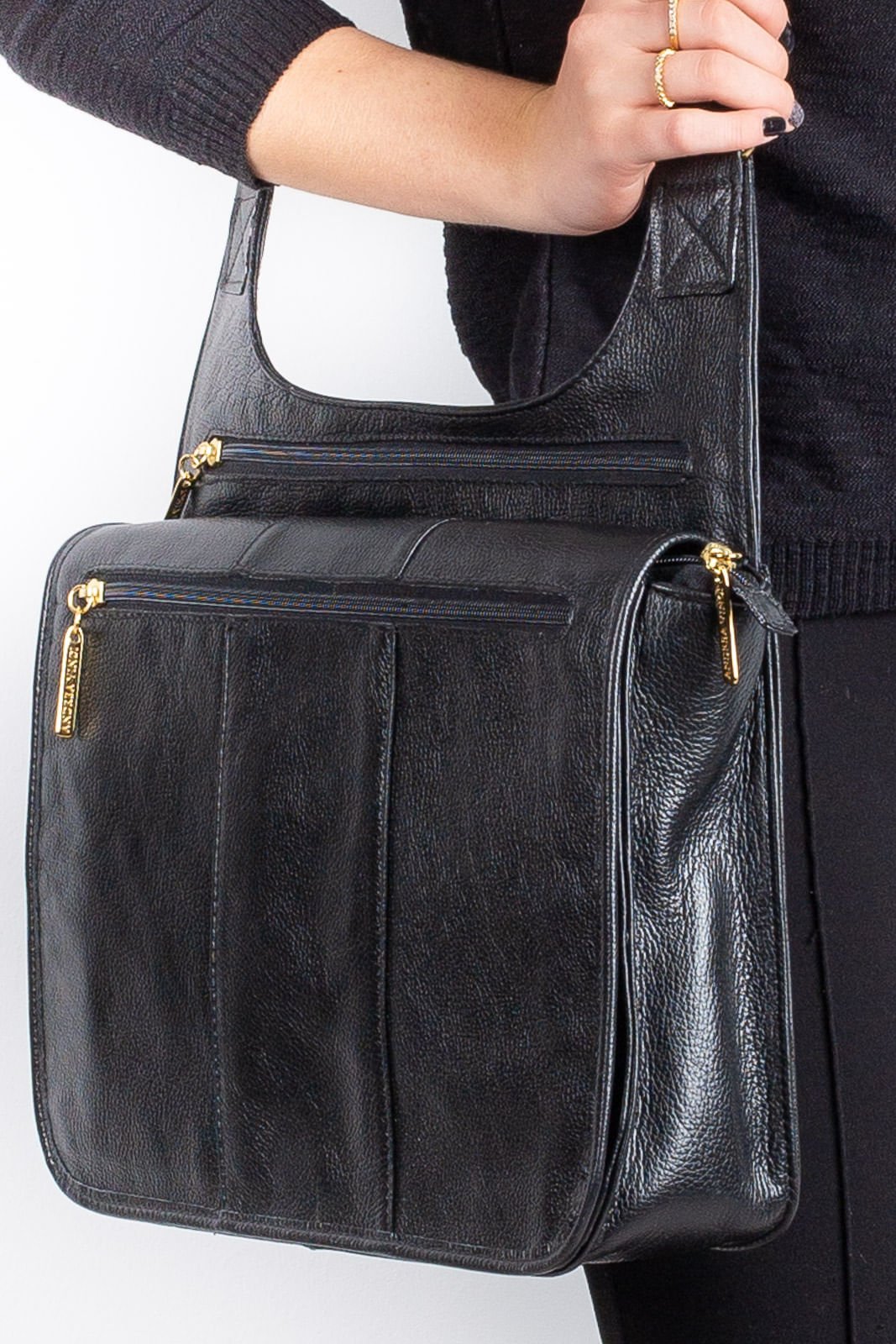 Pasta feminina de couro legitimo, no estilo carteiro, com ziper, tampa de fechamento. Possui diversos bolsos na parte interna e espaco para guardar pastas ou notebook de ate 14". Alem disso, ha uma divisoria na parte de tras, contendo dois bolsoes no tamanho total da pasta, para organizar documentos e outros objetos. Altura: 25 cm Largura: 36 cm Profundidade: 10 cm Comporta notebook: Ate 14 polegadas. Material: Couro legitimo.