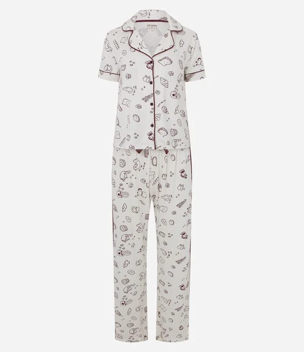 Pijama Americano Longo com Estampa de Mini Ícones Branco/Vinho
