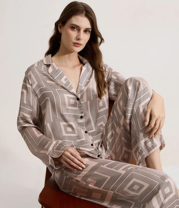 Pijama feminino confeccionado em cetim mais sustentável, no modelo americano. Composto por duas peças, blusa com gola lapela, manga longa, abotoamento frontal e calça com cós elástico. Ambos com estampa geométrica.