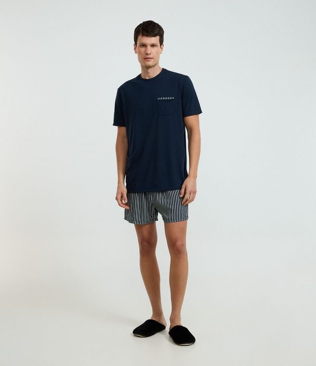Conjunto de pijama curto masculino confeccionado com mais sustentabilidade, camiseta em manga curta, gola redonda e bolso com detalhe de listras, bermuda com cós elastico e estampa de listra fina.