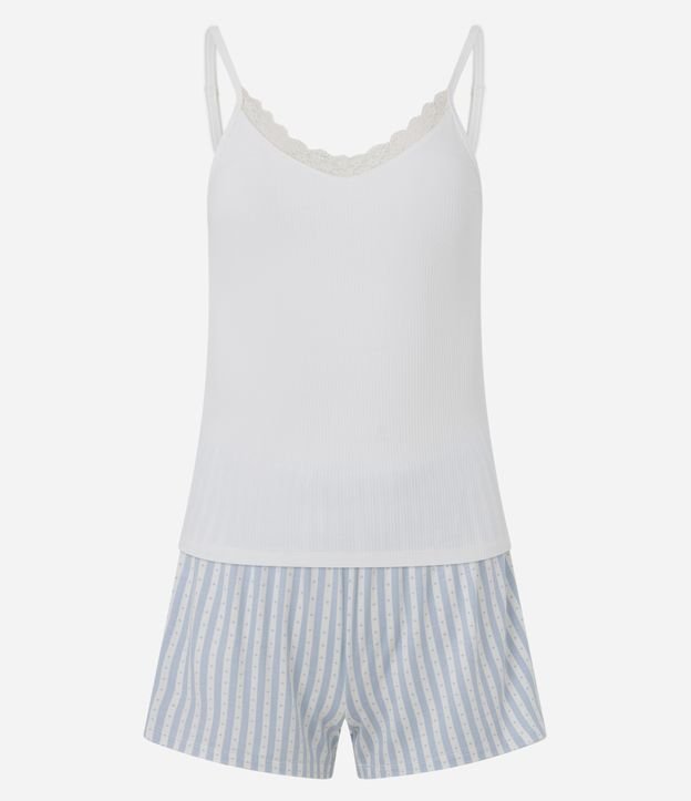 Conjunto de pijama feminino curto confeccionado em ribana, com blusa de alcinha e short de cós elástico. A blusa possui decote V com rendinha e textura canelada. O short conta com cós elástico e estampa listradinha.