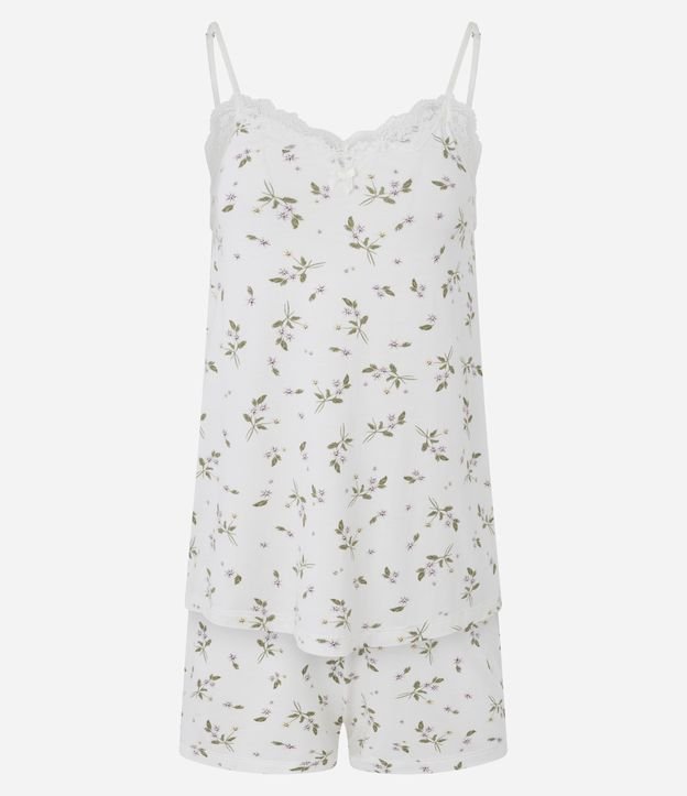 Pijama Curto em Viscose com Estampa Floral e Renda Branco