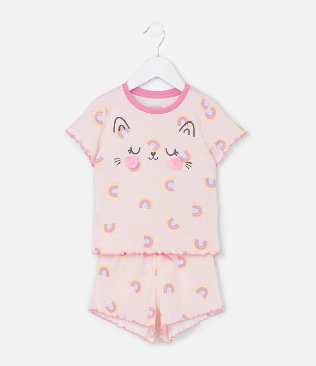 Pijama Curto Infantil com Estampa de Gatinho com Bochechas de Pompom - Tam 1 a 4 Anos