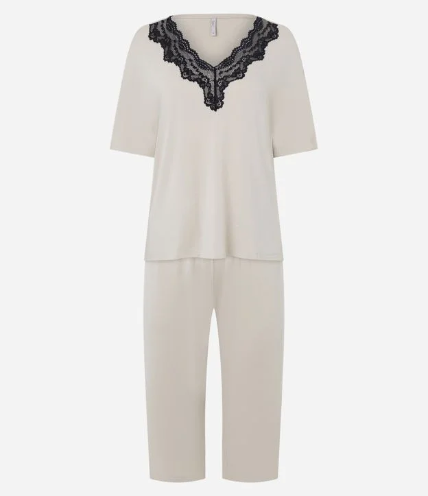 Pijama confeccionado em viscolycra com viscose mais sustentável, possui detalhe em renda na gola, manga curta e calça capri.