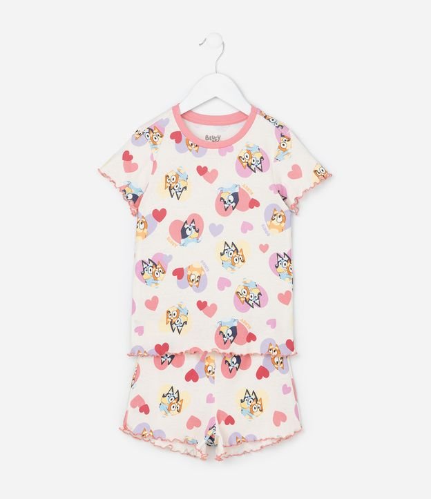 Pijama Infantil com Estampa Bluey e Bingo com Corações - Tam 3 a 8 Anos Off White