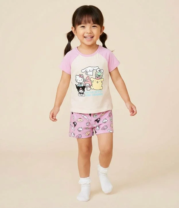 Pijama infantil confeccionado em meia malha de algodão certificado BCI, composto por blusa de manga curta com estampa localizada dos personagens Hello Kitty and Friends, criação clássica da Sanrio. Acompanha short com cós elástico, lacinho decorativo e estampa fullprint por toda a superfície.